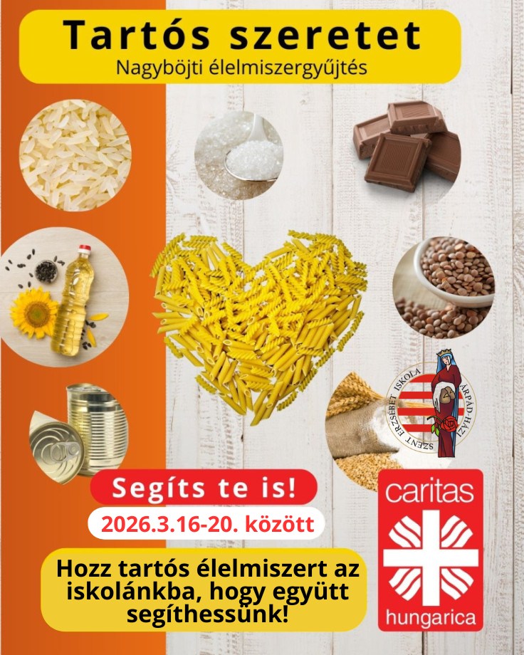 A Magyar Katolikus Püspöki Konferencia (MKPK) idén is meghirdeti a „Tartós szeretet” nevű nagyböjti tartósélelmiszer-gyűjtést a Katolikus Karitász országos hálózatának szervezésében. Az idei évben a plébániák mellett az Esztergomi Karitász Régió Központtal együttműködésben iskolánk is gyűjti a tartós élelmiszert. Az összegyűjtött élelmiszerek nemcsak táplálékot jelentenek, hanem a remény üzenetét és a szolgáló szeretet kézzelfogható jelét viszi a nélkülöző családokhoz.