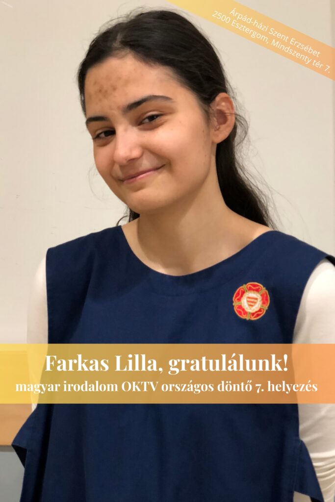 A magyar irodalom OKTV országos döntőjében Farkas Lilla 12.b osztályos tanulónk 7. helyezést ért el. Felkészítő tanára: Kollárné Szabó Márta.
